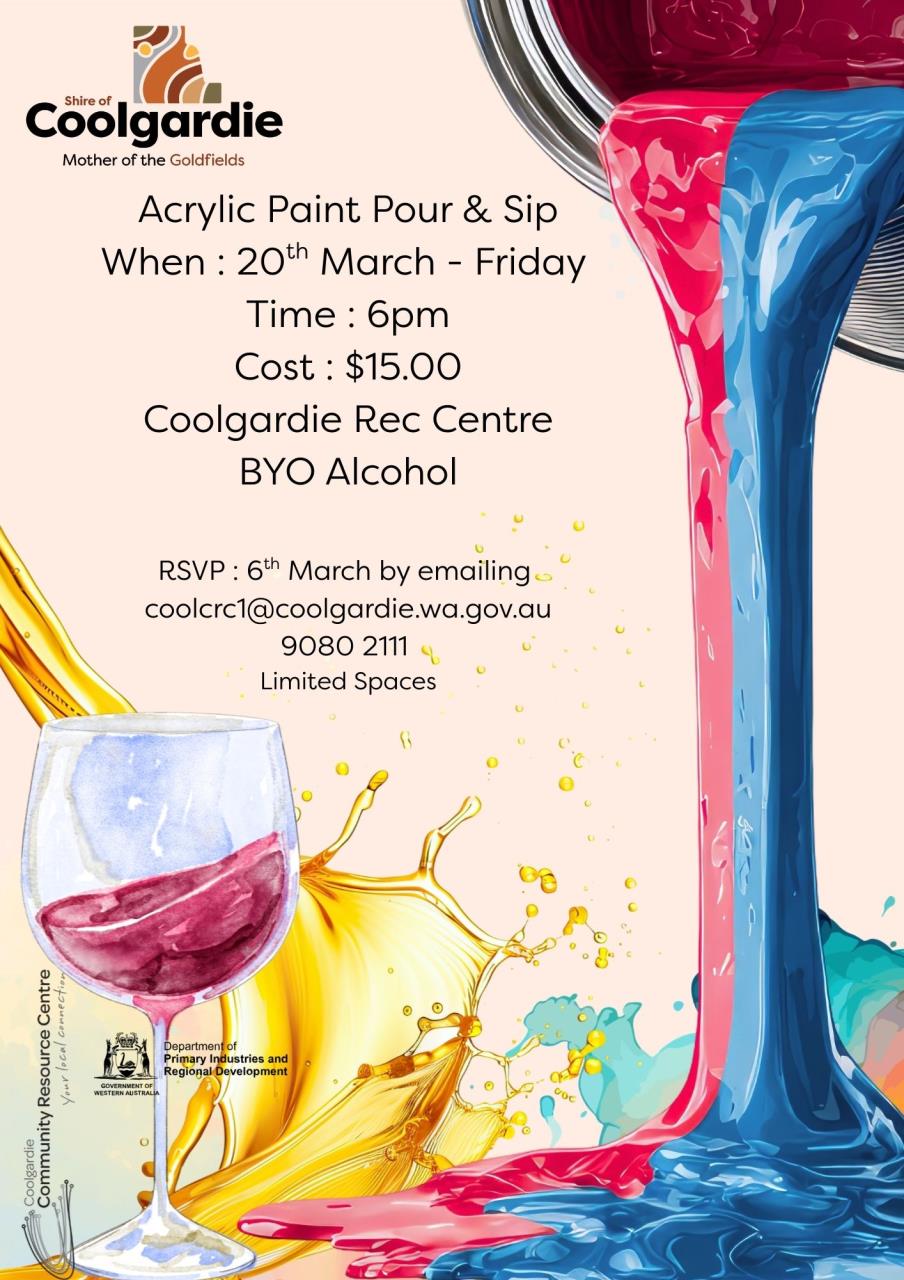 Acrylic Paint Pour and Sip$15.00 per person BYO AlcoholPlease RSVP by the 6/3/2026 by emailing coolcrc1@coolgardie.wa.gov.auor calling 9080 2111Limited Spaces so book in quick.