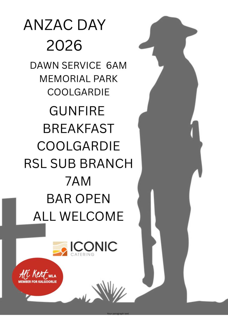 You are all welcome to Coolgardie RSL Sub Branch Dawn Service at 6am at Coolgardie Memorial Park, Bayley St and then afterwards at Coolgardie RSL Sub Branch for a Gunfire Breakfast at 7am.