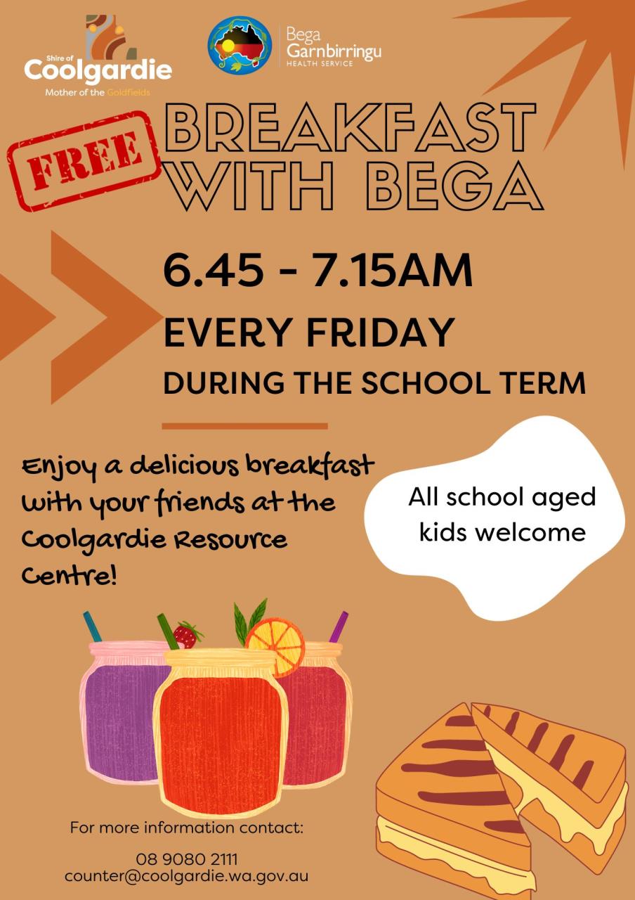 Enjoy a delicious breakfast with your friends at the Coolgardie Resource Centre. All School aged kids welcome every Friday 6.45am to 7.15am during the school term. **24 May 2024 has been cancelled.