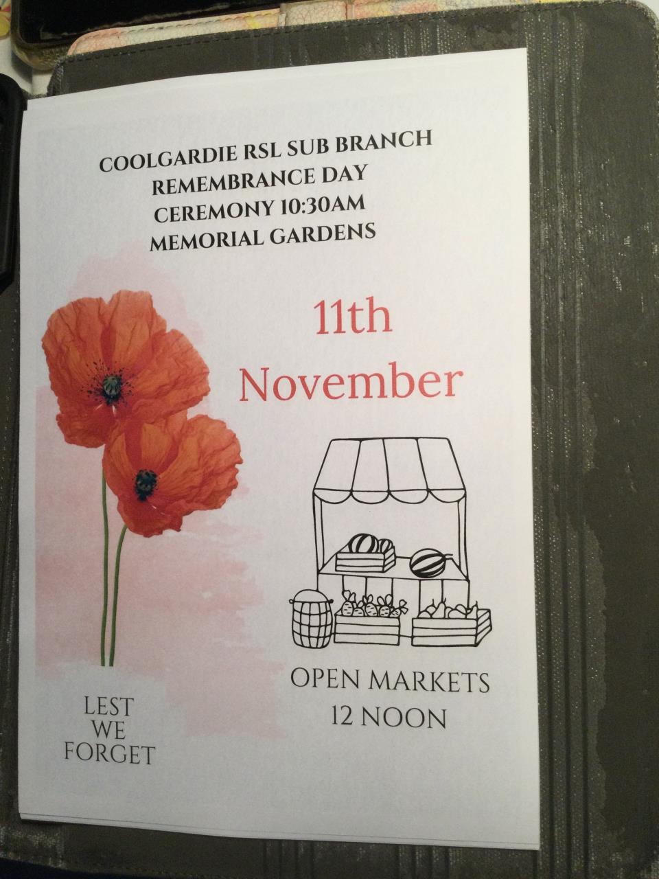 Ceremony at Coolgardie Memorial Garden at 11am followed by Markets and an open bar from 12noon at Coolgardie RSL Sylvester St. Food available for sale.