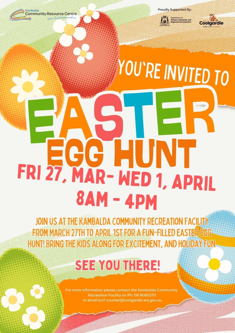 Join us at the Kambalda Community Recreation Facility from March 27th to April 1st for a fun - filled Easter Egg Hunt! Bring the kids along for excitement and a holiday fun.