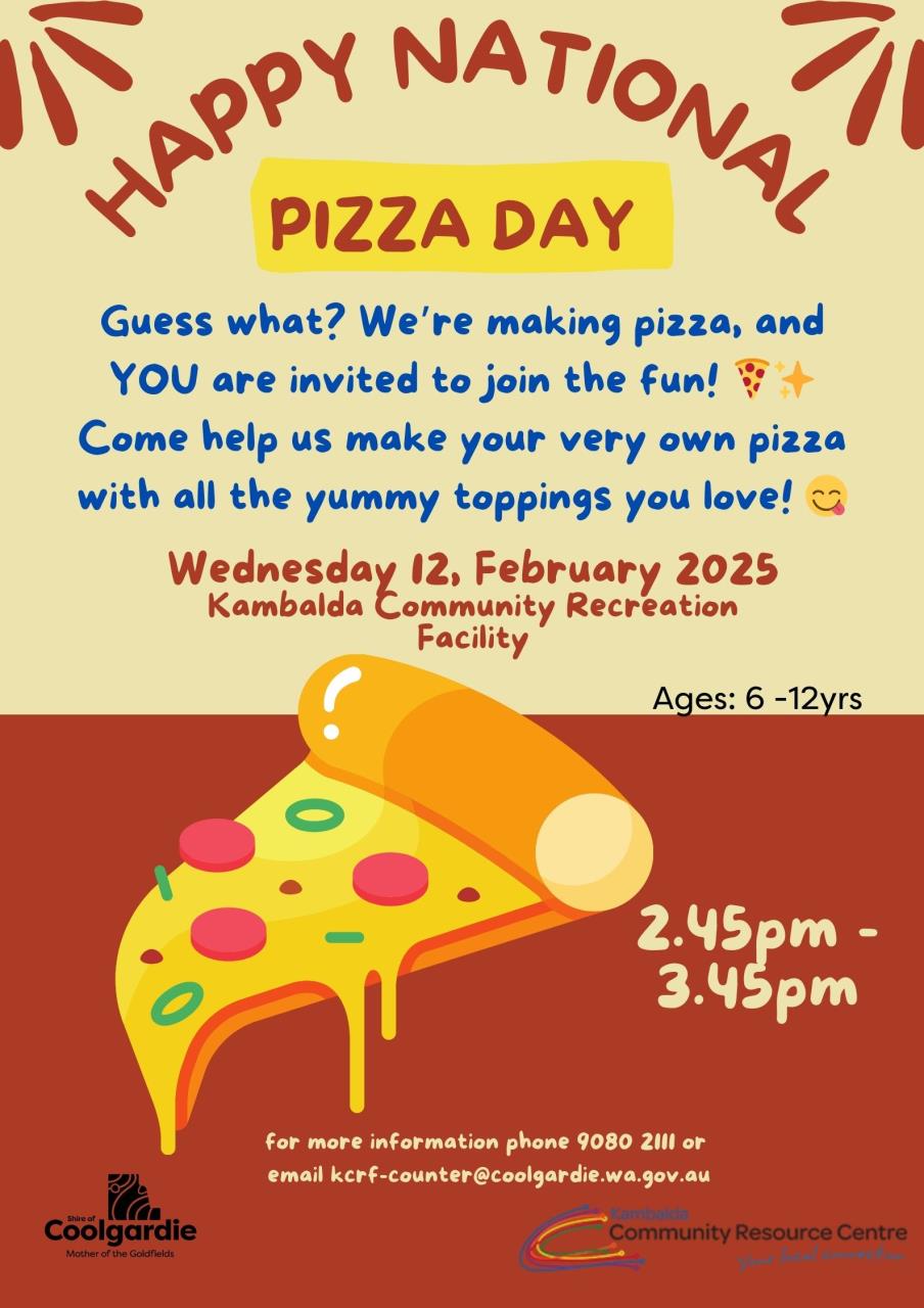 Guess what? We're making pizza, and you are invited to join the fun! come help us make your very own pizza with all the yummy topping you love! Event: Pizza Day Event date: Wednesday 12, February 2025 Event Location: Kambalda Community Recreation Facility Event Time: 2.45pm -3.45pm Event cost: free Event age group: Ages 6-12yrs