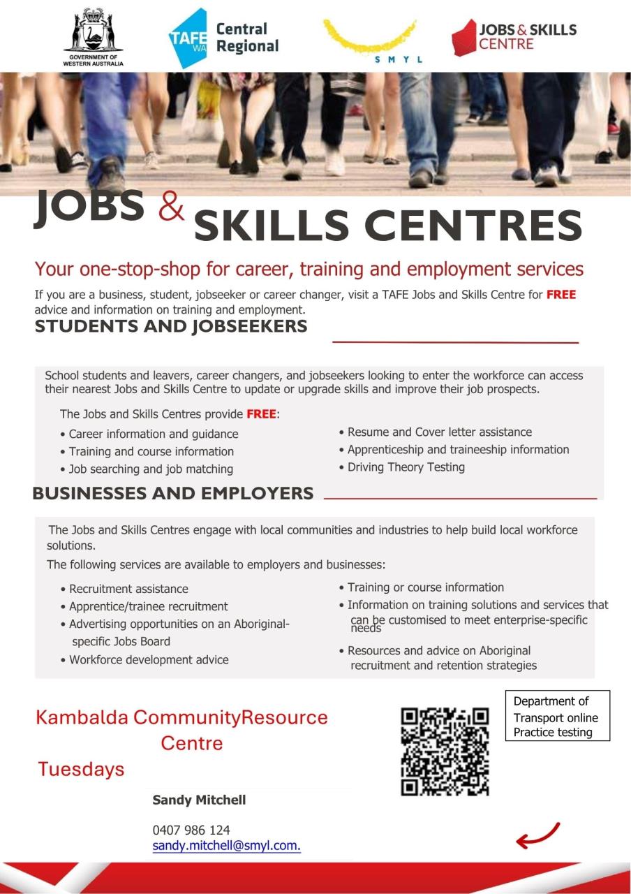 Jobs & Skills Centre is available 𝐞𝐯𝐞𝐫𝐲 𝐓𝐮𝐞𝐬𝐝𝐚𝐲 at the 𝐊𝐚𝐦𝐛𝐚𝐥𝐝𝐚 𝐂𝐨𝐦𝐦𝐮𝐧𝐢𝐭𝐲 𝐑𝐞𝐜𝐫𝐞𝐚𝐭𝐢𝐨𝐧 𝐅𝐚𝐜𝐢𝐥𝐢𝐭𝐲 from 𝟗𝐚𝐦 𝐭𝐨 𝟏𝐩𝐦 with Sandy 🙂