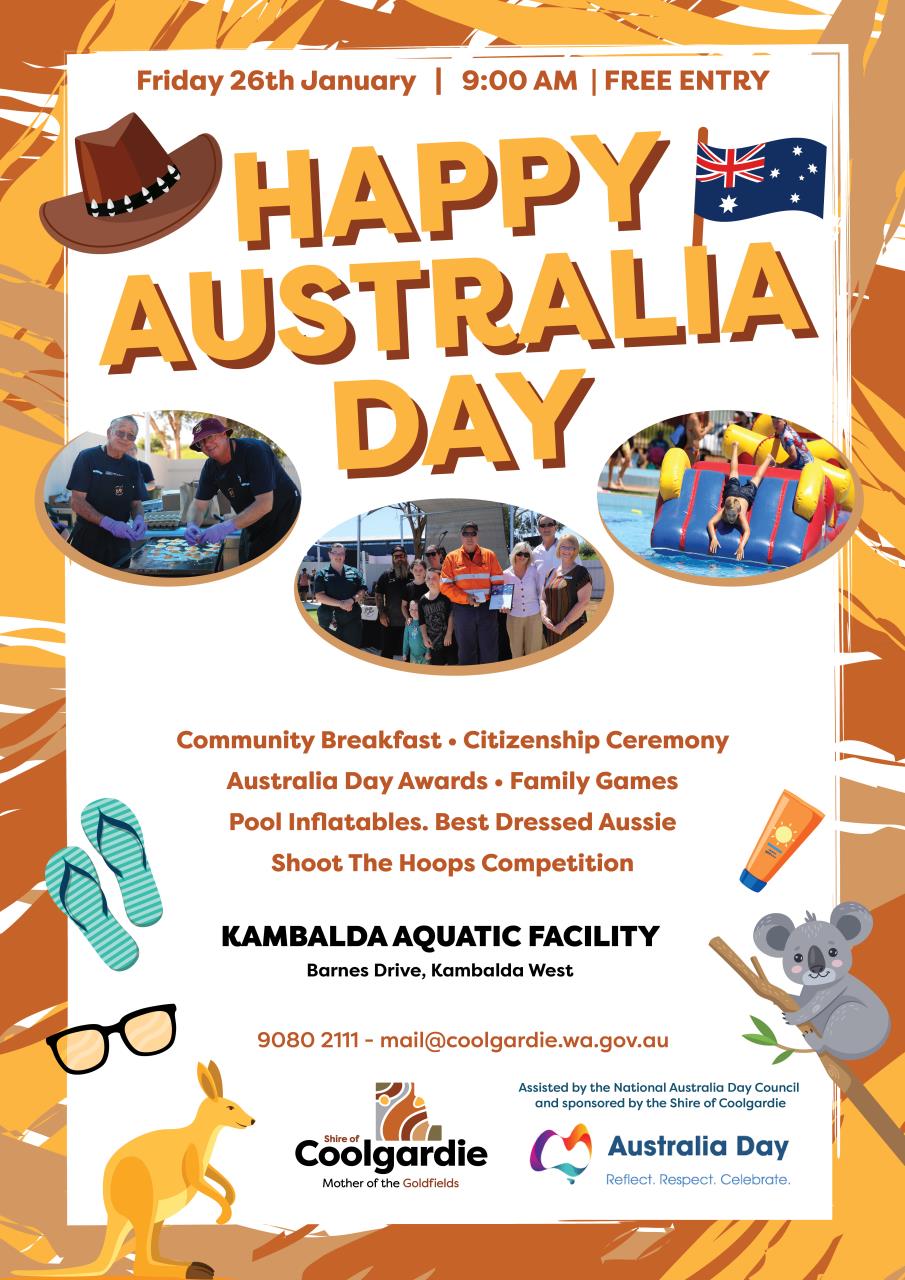 This event promises to be a vibrant and engaging celebration of all things Australian. Come together with friends, family, and fellow community members to enjoy a day of camaraderie and festive activities. Mark your calendar for Australia Day at the Kambalda Aquatic Facility – a perfect way to honor our nation's day in the heart of our welcoming community. See you there!