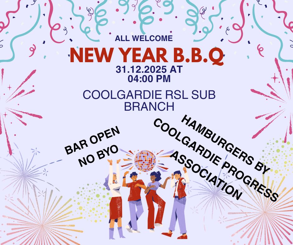NEW YEAR'S EVE AFTERNOON AND B.B.Q. FROM 4PM THE OUTBACK RODEO BAR WILL BE OPEN COOLGARDIE PROGRESS ASSOCIATION WILL BE COOKING B.B.Q HAMBURGERS FULLY LICENCED, NO BYO ALL WELCOME