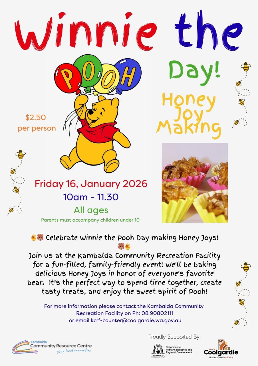 Join us at the Kambalda Community Recreation Facility for a fun-filled, family-friendly event! We'll be baking delicious Honey Joys in honor of everyone's favorite bear. It’s the perfect way to spend time together, create tasty treats, and enjoy the sweet spirit of Pooh!